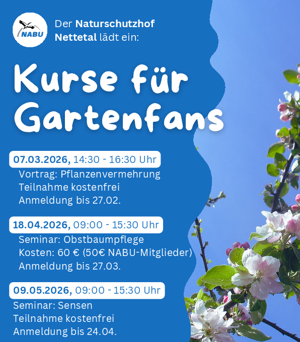 Die Tage werden länger und wir freuen uns bereist auf die Gartensaison. Zu den Themen Pflanzenvermehrung, Obstbaumpflege und Sensen bietet der Naturschutzhof in Nettetal in diesem Frühjahr Vorträge und Workshops für alle Interessierten an. Die Anmeldung erfolgt direkt auf der Website des Naturschutzhofs. Dort gibt es zu allen Veranstaltungen auch weitere Informationen.