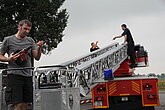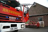 Die freiwillige Feuerwehr aus Willich hat den nötigen Hubsteiger und half dem NABU Willich einen Nistkasten an der Giebelspitze zu montieren.